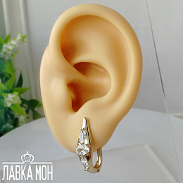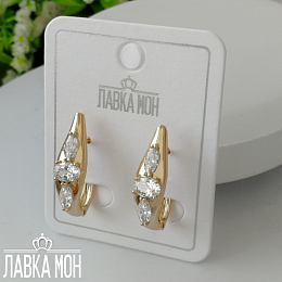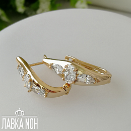 Cерьги в форме мягкого ромба с вставками маркизами и овалом, выполнены в желтом тоне золота, фабрикой XP. Хорошо занижен штифт (закрывает место прокола). Общая высота около 2.1см.