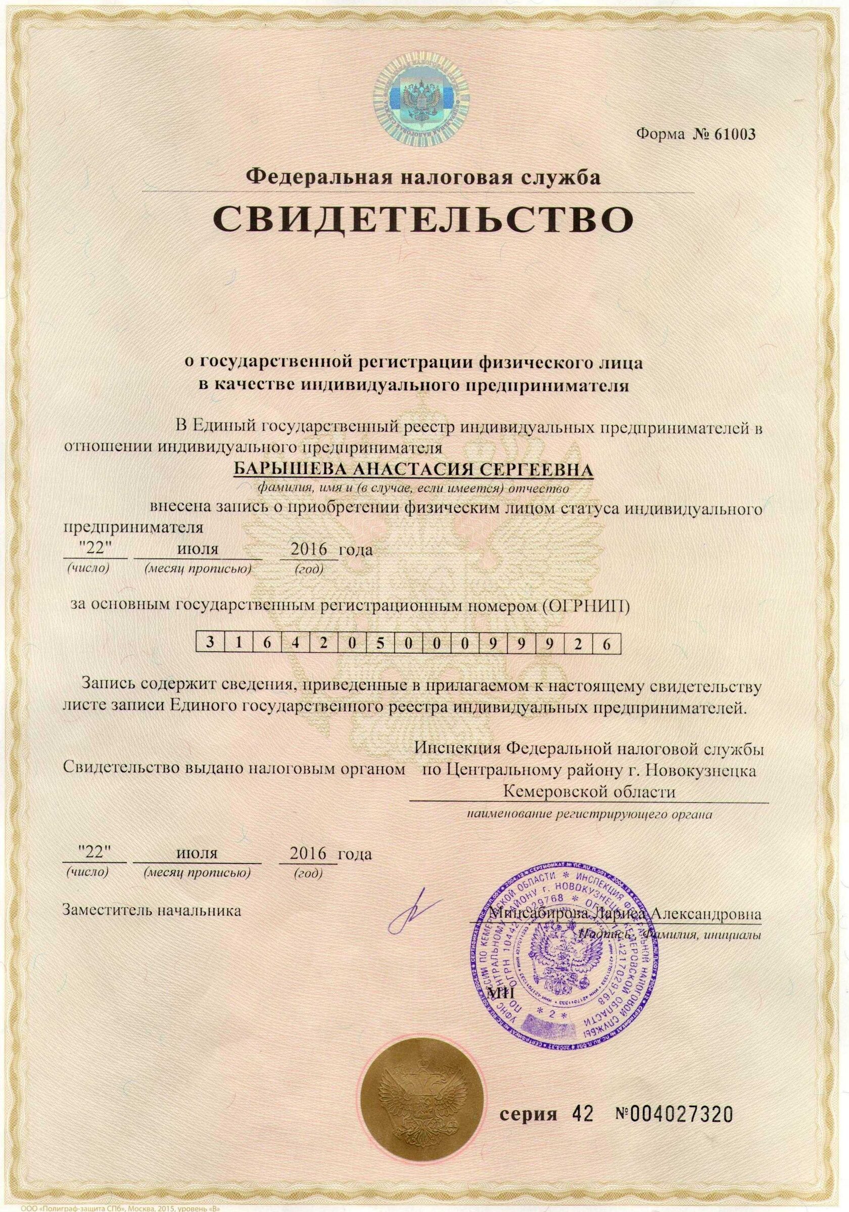 Свидетельство (ОГРНИП)